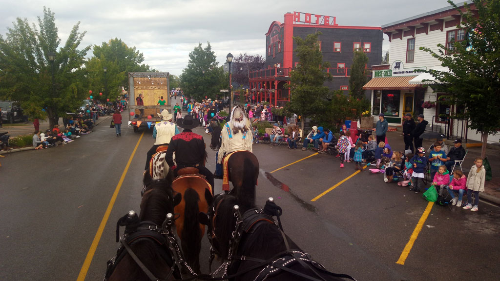 This Was Our View From The Authentic 1880's Concord Stagecoach in The 2019 Cochrane Labour Day Parade ~ Monday Sept 2nd, 2019! We Actually Brought Home The Bacon With The "Best Corporate Float" in this Classic Canadian Foothill Town's Annual Parade! With 80 floats, this was the longest parade Cochrane has ever seen! Leading our entry was Rafter Six Ranch Owner Stan Cowley & Blackfoot Nation Elder Kelly Good Eagle!